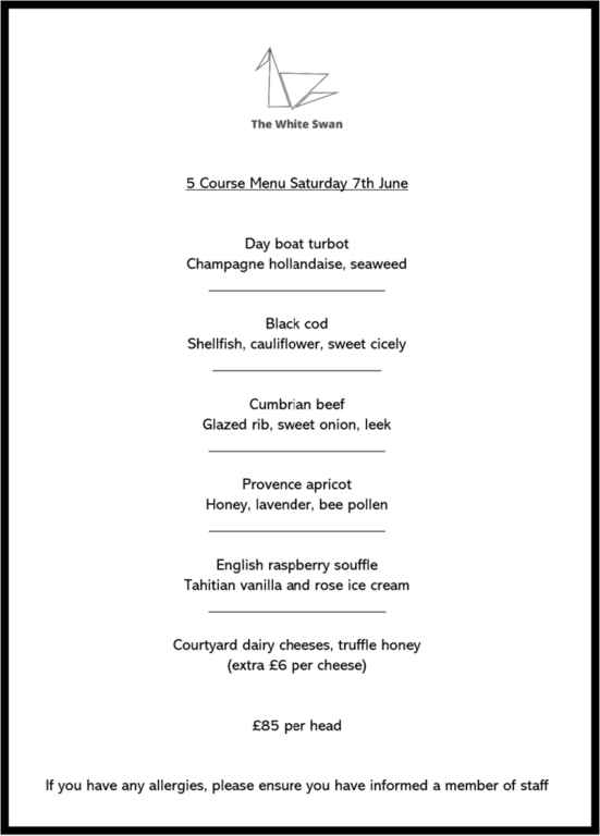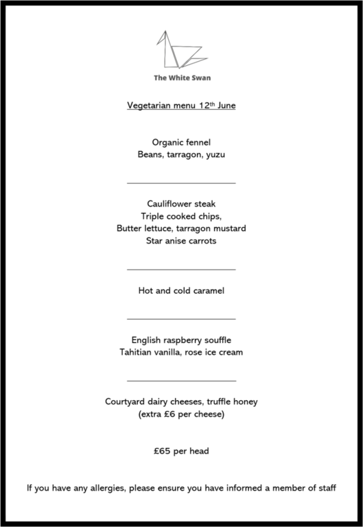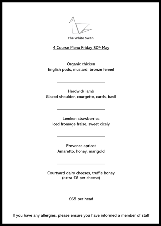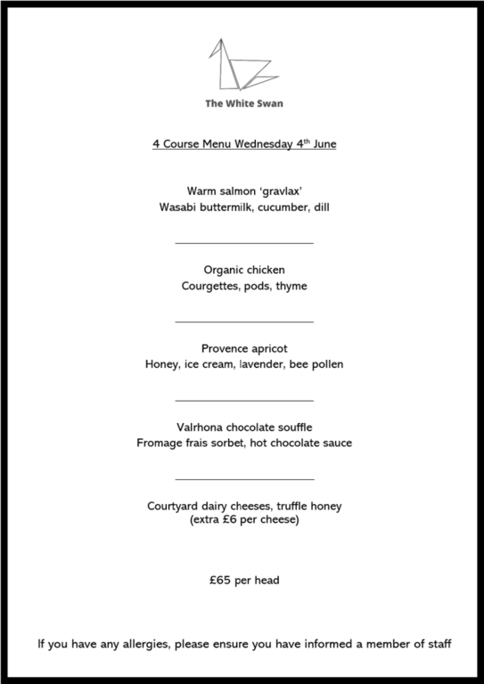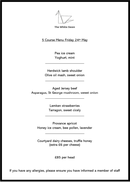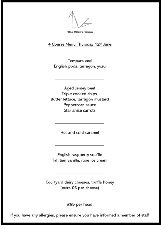We feel that the anticipation of not knowing what you are about to eat is part of the fun of coming to The White Swan.